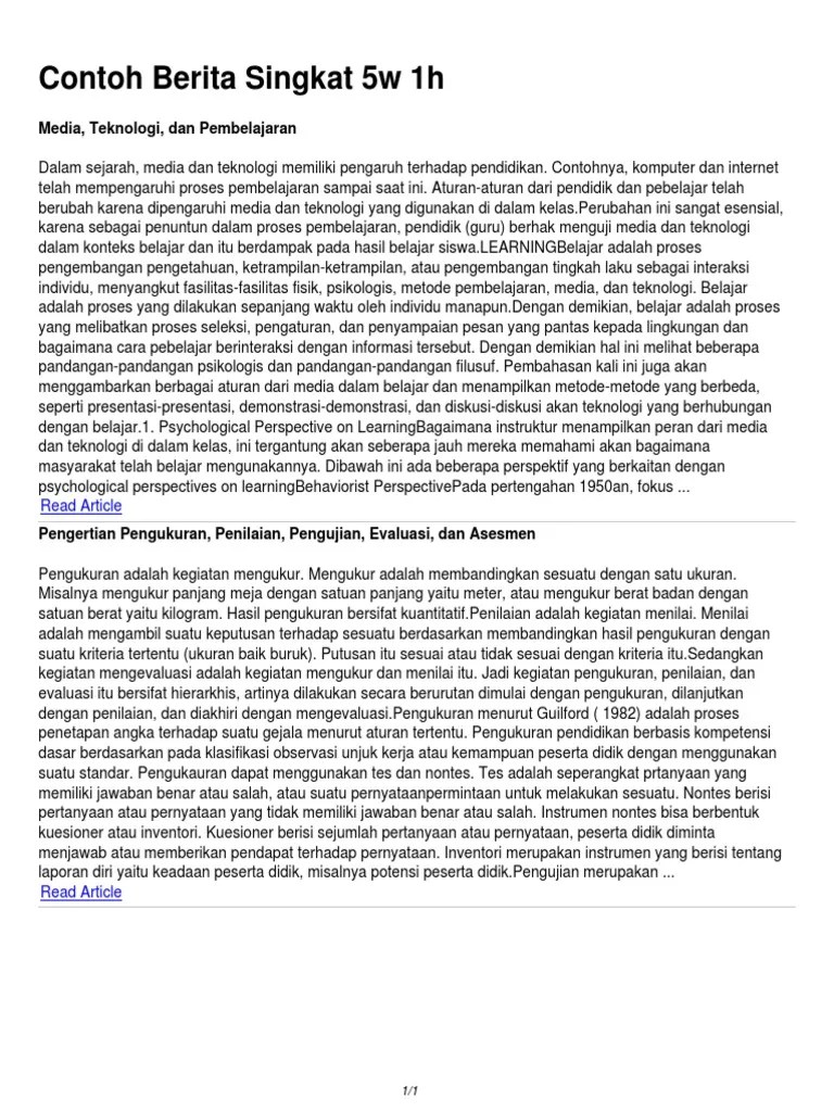 Selain itu, berita juga bisa diartikan sebagai kabar, laporan, pemberitahuan, atau pengumuman. Rumus 5w+1h merupakan unsur penting pada teks berita untuk mendapatkan. Sekolah, reporter olahraga, eksposisi, dan berita singkat . Dengan demikian, contoh berita yang mengandung 5w+1h adalah sebagai berikut:. Dalam menyimak berita kita harus memahami isi berita .