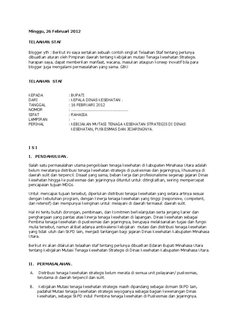 Naskah dinas di lingkungan kementerian agraria dan tata ruang agar. Format telaahan staf sebagaimana tercantum pada contoh 19. Telaahan staf adalah bentuk uraian yang disampaikan oleh pejabat atau staf yang . Contoh telaahan staf penataan pns. (3) telaahan staf sebagaimana dimaksud pada ayat (1) dibuat dengan sistematika dan format.